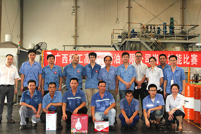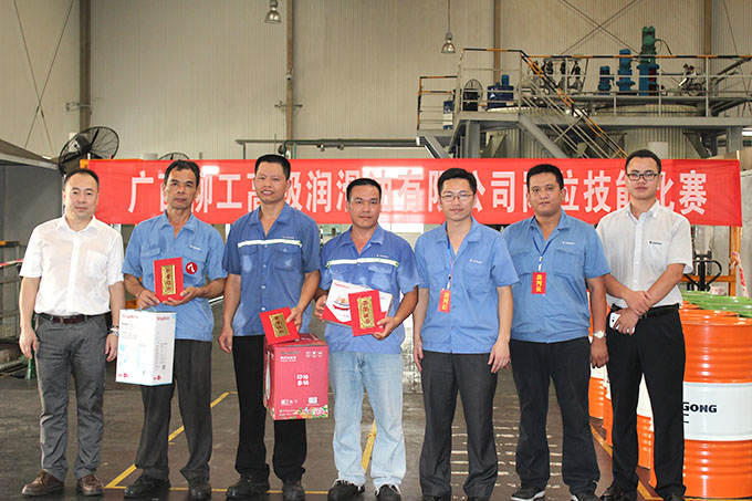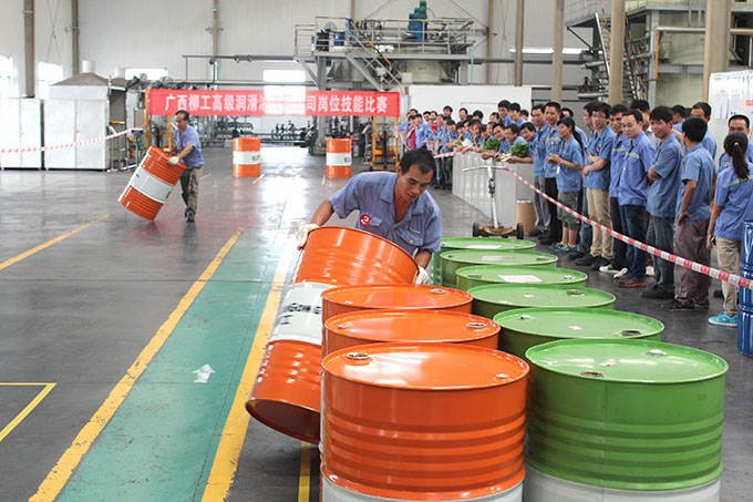 ? ? ? ? 2014年6月26日,广西柳工高级润滑油有限公司岗位技能比赛在调合厂正式拉开序幕。随着裁判清脆的一声哨响,200L油桶转移比赛正式开始。“加油,加油!”的助威声在调合厂车间此起彼伏,经过紧张激烈的角逐,谭定羽获得第一名,谢永华、李占扩分别获得第二、三名。