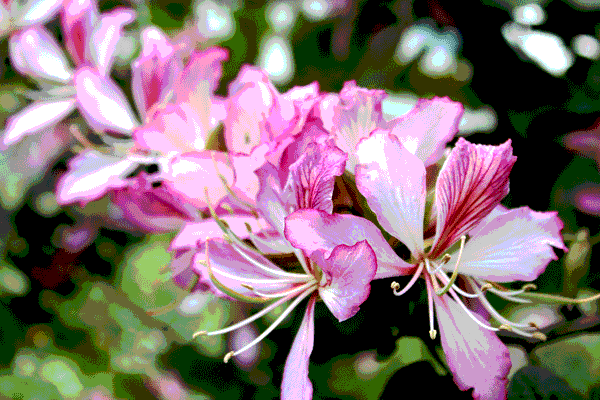 紫荆花花大如掌,略带芳香,红色或粉红色的五片花瓣均匀地轮生排列,十分美观。